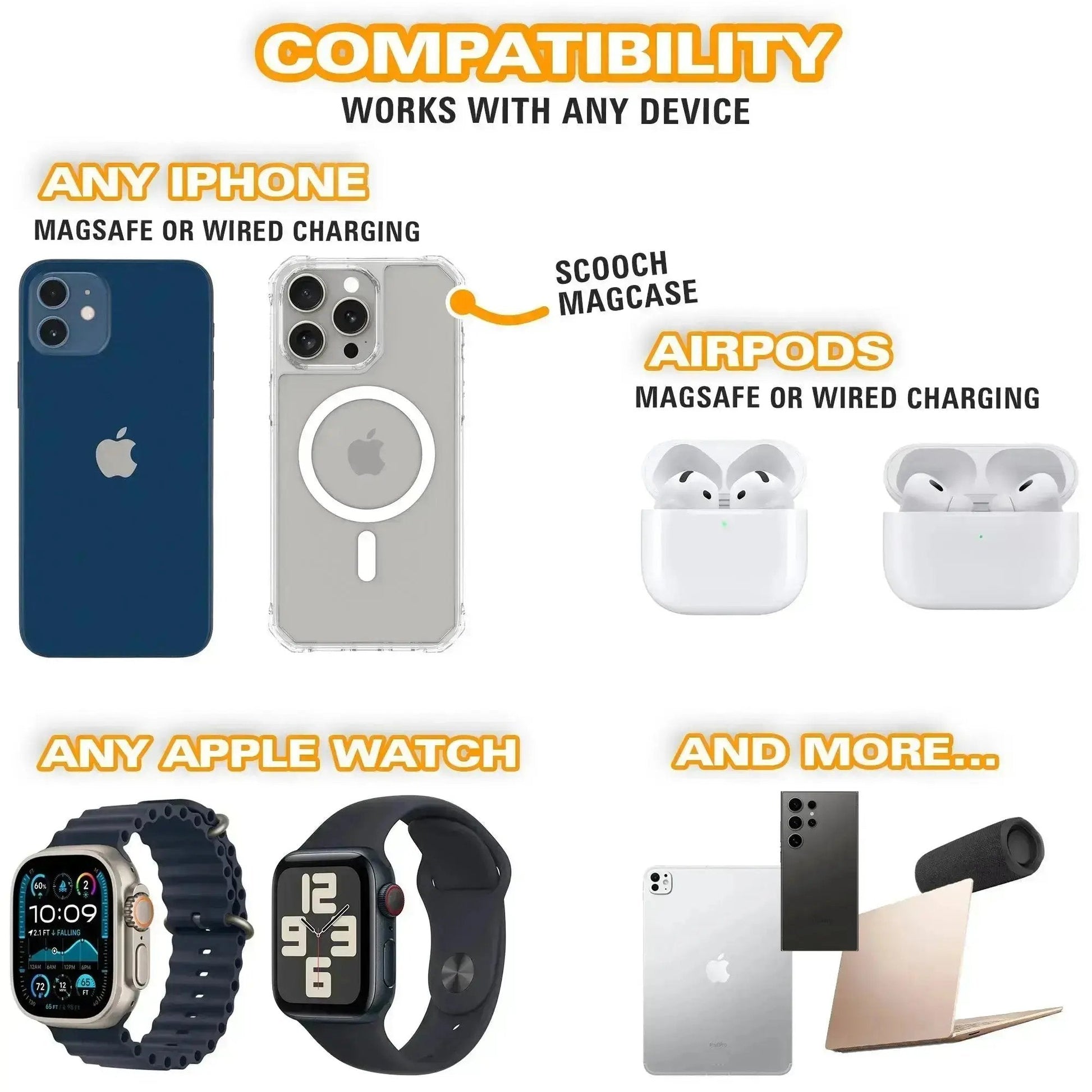 15W MAGSAFE AND MULTI-DEVICE COMPATIBILITY: Features a MagSafe pad for iPhones, Qi-enabled Android phones, and AirPods, plus a dedicated 3W Apple Watch charging pad.